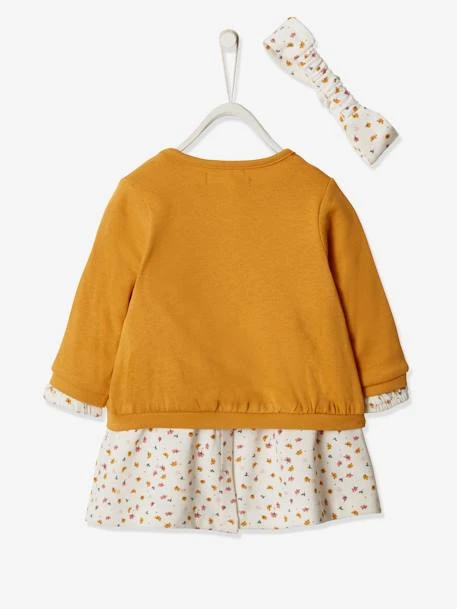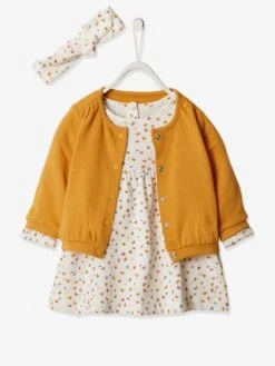 Ensemble 3 pièce robe + cardigan + bandeau bébé fille en pur coton.