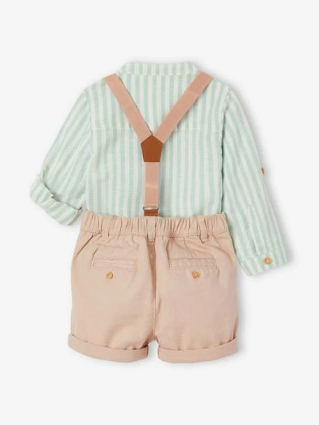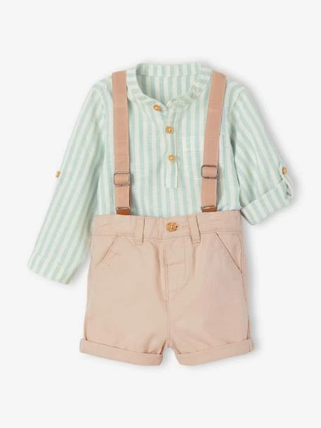 Ensemble bébé chemise 60% coton, 40% polyester, short 100% coton.