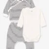 Ensemble bébé naissance : blouse 100% coton, bloomer en tissu flanellisé 100% coton, collants 71% coton, 27% polyester, 2% élasthanne.