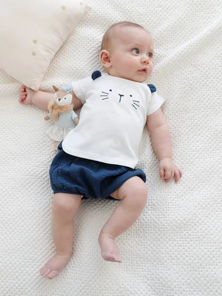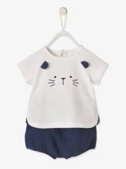 Pour une journée exceptionnelle, une fête ou un quotidien raffiné, ce duo trop craquant va ravir les mamans ! T-shirt bordé et oreilles de tigre, short gaufré en gaze de coton… tout est prévu pour mettre en beauté les nouveau-nés.