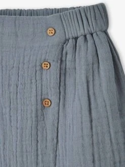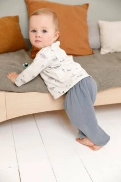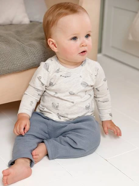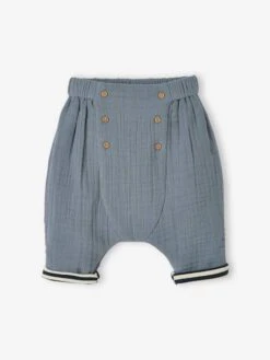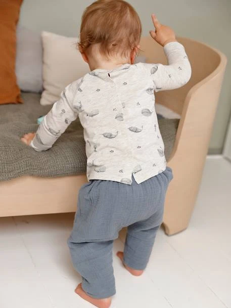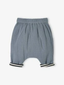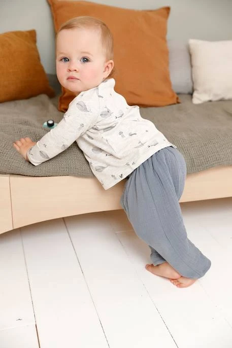 Pantalon bébé naissance en gaze 100% coton, doublure rayée en jersey 100% coton.