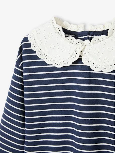 Un esprit marinière dans l’air du temps ! Nos stylistes ont eu la bonne idée d’y ajouter un col Claudine en broderie anglaise pour un petit air rétro craquant. Facile à porter au quotidien, c’est la petite robe toute trouvée pour la rentrée ! A porter simplement avec des baskets et à réchauffer d’un gilet.